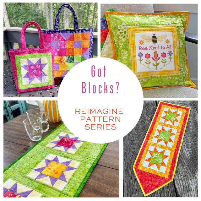 Meet the ReImagine series—your new favorite way to give leftover, orphan, or “what-do-I-do-with-these?” quilt blocks a brand-new life! Machine embroidery blocks, cross-stitch blocks, test blocks… if it’s a block looking for a home, it’s invited.