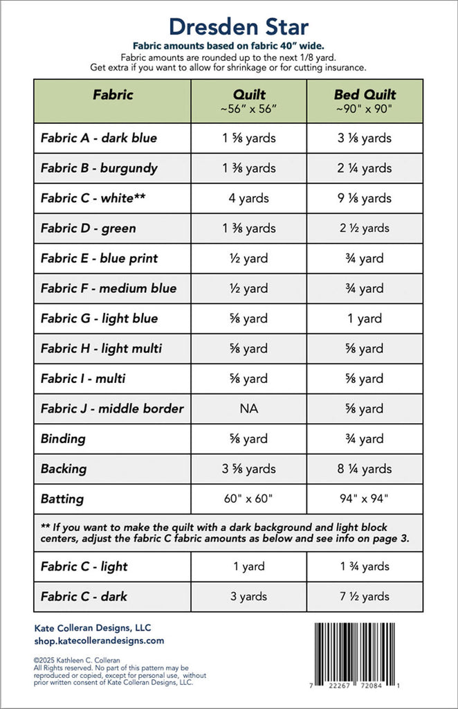 Dresden Star is a new paper pieced quilt pattern with star designs similar to Dresden Plate, and with a wonderful center star design. Designed for the intermediate quilter, there are two sizes: a bed quilt at 90" x 90" and a lap quilt at 56" x 56".